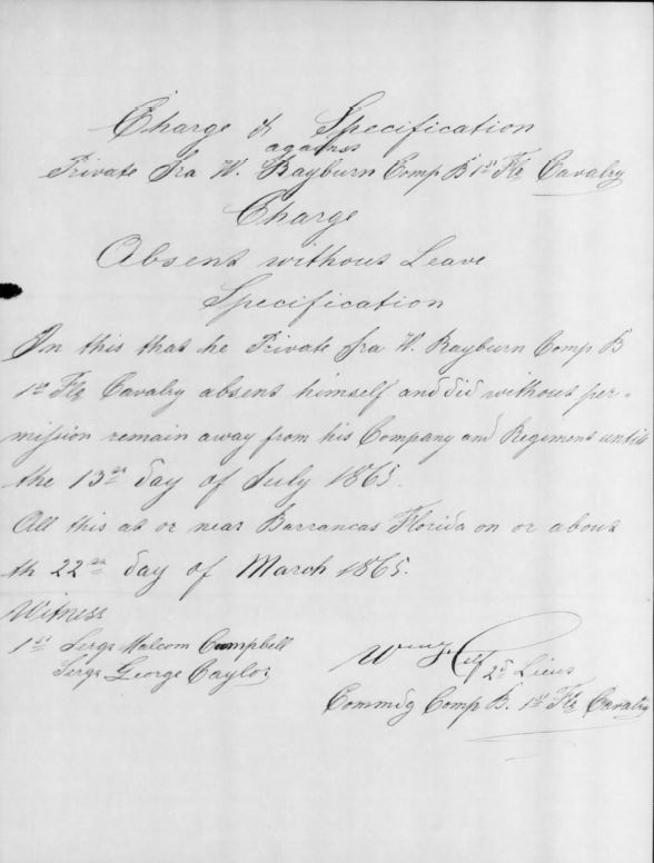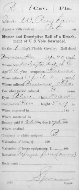 Ira did serve in the Civil War on the Union side. He MAY have also been a Confederate soldier before that. His brother, James W. and son James W. both served on the Confederate side in Florida. The brother, James W. Rebren, (another alternate spelling) died of brain fever while serving. James Wiley (the son) was described as 5′ 8-1/2″ tall with blue eyes and light hair and light complexion.